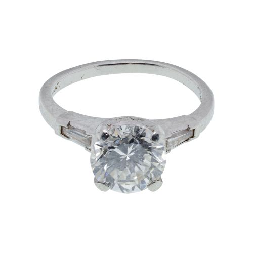 Having a round cut diamond weighing approximately 2.09 carats (8.07 x 8.04 x 5.27mm), H color, SI-1 clarity, strong florescence noted, flanked on each side by a tapered baguette (4.45 x 1.1/0.9mm) (marked "10%IRID.PLAT")