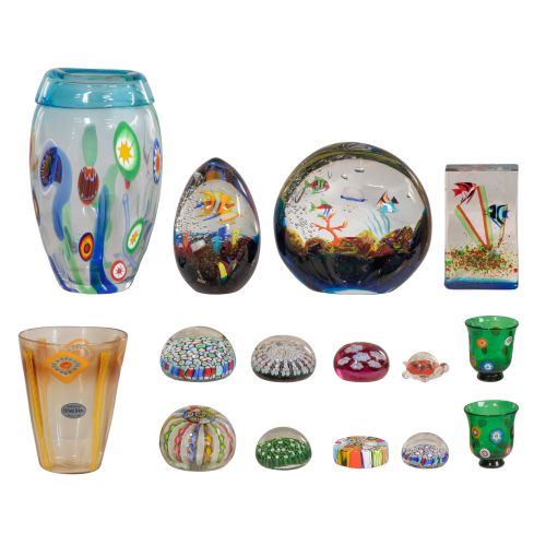 (15) items, in a variety of shapes, colors and designs, from traditional to modern including vases, paperweights and other decorative items, in designs such as millefiori and sommerso, some having signatures, some having original labels