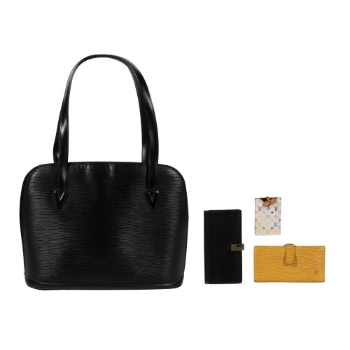 (4) items including a black leather Epi bag, a gold Epi Sarah wallet, a monogrammed luggage tag as well as a black wallet by Gucci