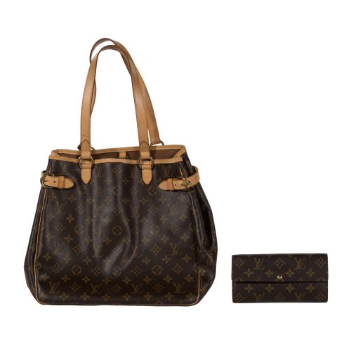 (2) items including a vertical Batignolles monogrammed canvas handbag having Vachetta leather trim, gold-tone hardware, dual flat leather handles, brown canvas lining, one zipped pocket, one slip pocket, top hook closure, adjustable side gussets and dustcover as well as a limited edition monogrammed Stephen Sprouse Sarah wallet having a pink leopard lining
