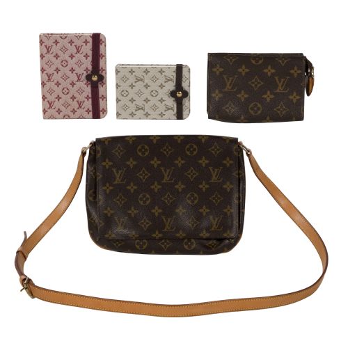 (4) items including a monogrammed canvas Musette Tango short strap and canvas toiletry pouch and (2) notepads in monogrammed covers, having boxes