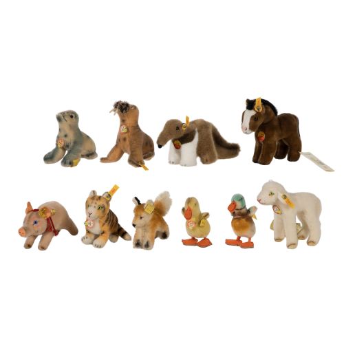 Approximately (45) total items including small size animals having various poses, colors and styles, most Steiff items having button, most retaining ear tag, some retaining paper identification tag at collars, some having hang tag certificates; together with (5) unmarked mohair animals