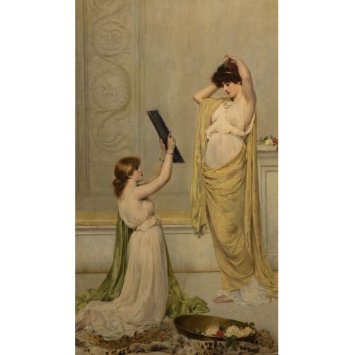 1880, signed and dated lower edge, left of center, depicting a woman adjusting her hair looking in a mirror being held by a young servant girl, in a gold-tone gesso on carved wood frame