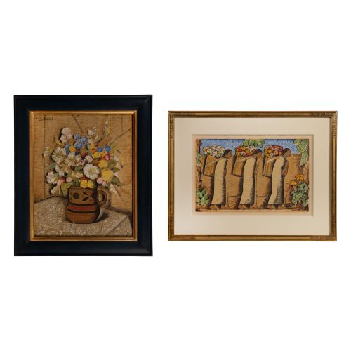 (2) undated items, signed, including "Vendedores de Flores" depicting women carrying sacks filled with flowers and "Flores" a floral still life, both framed under acrylic in painted wood frames, retaining William Talbot Fine Art, Santa Fe gallery label verso