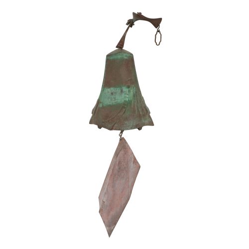 Undated, having cast cypher on side of patinated bell, on hanging chain and having a sheet bronze wind-catcher attached to the clapper, including a printed informational single-fold brochure