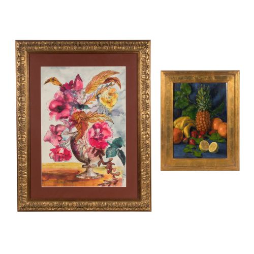 (2) items including an oil on canvas still life of fruit, signed "Cadwallader W" lower left, in a gold-tone wood frame and a watercolor and ink depiction of "Flores Fantasticas", signed and dated "Garcia Cabalos '70" lower left, matted behind acrylic in a gold-tone carved wood frame