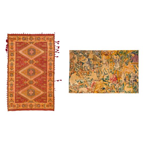 (2) items including a 20th century copy of the 15th century French pictorial "Les Bucherons" tapestry (4 ft. 8-in. tall x 7 ft. 6 in. wide) having a John M. Smythe hang tag as well as an 8.5 x 4-foot afghan