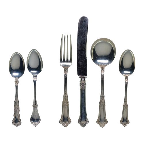 (53) total items including mismatched and incomplete sets consisting of (6) 8 1/2-inch old French knives, (6) 7 1/4-inch dinner forks, (22) 6-inch teaspoons, (6) 6 3/4-inch round soup spoons; together with various other singular silver items (most marked)