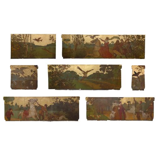 1903, removed in (7) various sized panels from the dining room of the Charles A. Goodyear home in Chicago, Illinois, having been commissioned by Goodyear, signed on panel 4 and artist annotated verso "Dining room fries, Goodyear", depicting a hunting scene in color and gilt, unframed