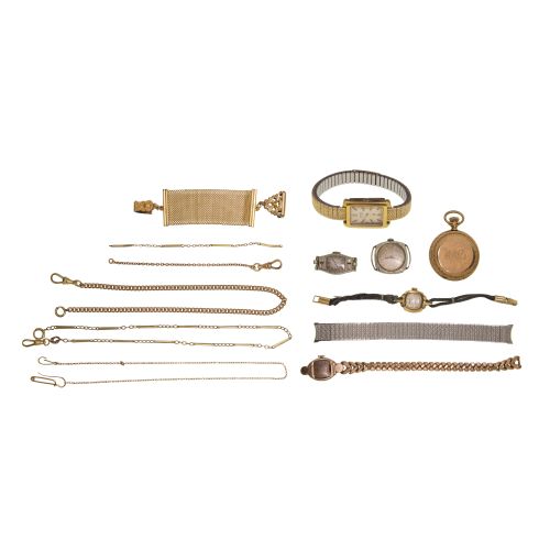 (2) items including an unbranded case having diamond accents (marked "18k" inside back of case) and an Elgin (marked "14k" inside back of case); together with a gold-filled Elgin hunter case pocket watch serial #9299184, c.1900 as well as wristwatches, bands and gold-filled watch chains
