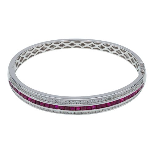 Lot #204: 18k White Gold, Ruby and Diamond Hinged Bangle Bracelet