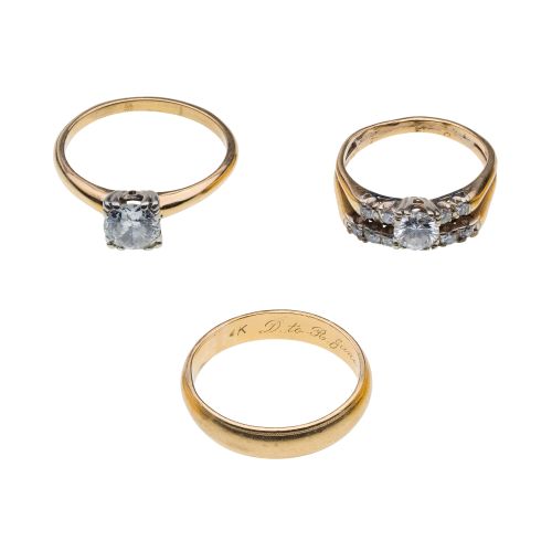 (3) items including a solitaire round cut diamond in a square setting, a round cut diamond wedding set including a solitaire engagement ring connected to a diamond band as well as a plain gold band (all marked "14k")