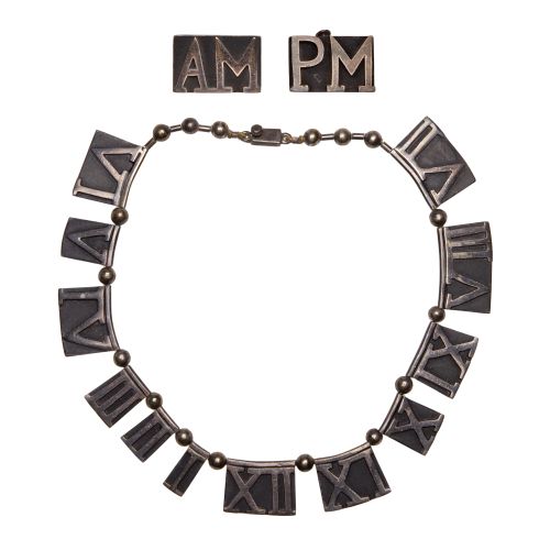 (2) items including a necklace and a pair of screwback earrings, having raised Roman numerals against an oxidized background, from the #5201 Roman Numerals suite (stamped and marked "925")