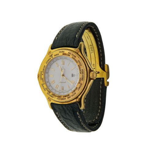 Automatic having a white dial with gold Roman numeral hours, world time function, date aperture at 3 and leather band (marked "18k")