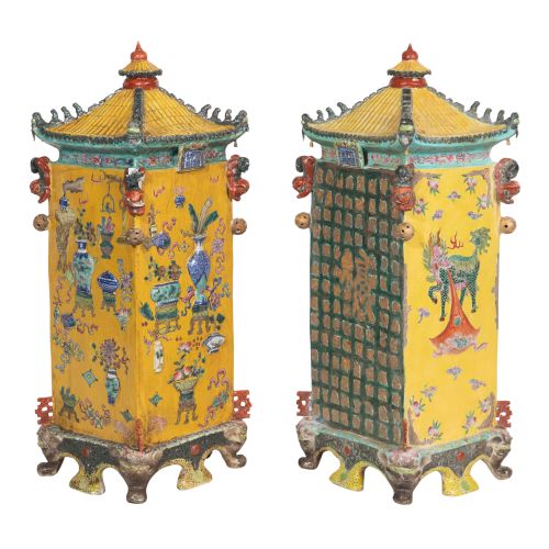 A like pair, pagoda shaped and roofed in yellow, one having all sides decorated by raised enamel auspicious symbols on yellow ground, the other having mythological beasts on yellow on two sides and raised gilt characters on black ground on two sides, both having underglaze blue Qianlong archaic seal style marks below roofline