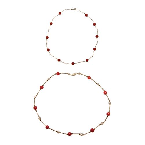 (2) items including a red coral and pearl beaded necklace and a red coral beaded chain style necklace (marked "14k" / "585")