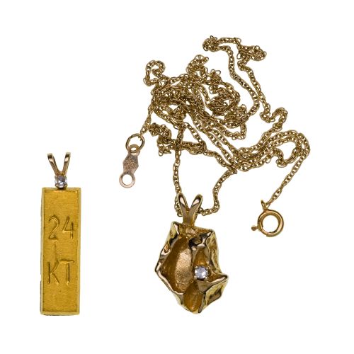 (2) items including a bar pendant engraved "24k" topped by a diamond accent and a free form nugget pendant having a diamond accent on a necklace (unmarked)