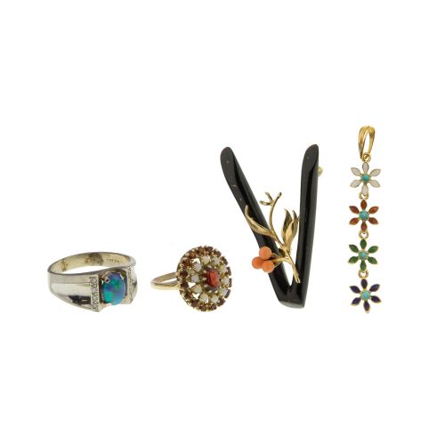 (4) items including a gemstone floral pendant (marked "18k"), an opal ring and a black coral pin in original box (marked "14k") as well as an opal and garnet ring (marked "10k")