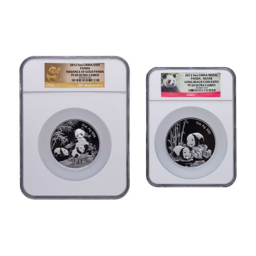 Lot #350: China: 2012 and 2013 50 Yuan .999 Fine Silver Panda Coins PF-69 UCAM NGC
