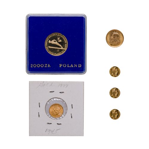 (6) total items including a 1981 1/10oz Krugerrand, a XIII Olympics Polish 2000 ZL and a Mexican 2 peso; together with (3) Mexican gold tokens (unmarked but XRF tested as 10k)