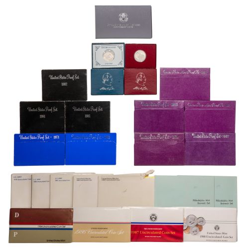 (26) items including (2) 1982 90% silver proof Washington 50c, a 1991 2-coin Mount Rushmore Anniversary set, proof sets including 1971, (2) 1981, 1982, 1983, 1984, 1985, 1987 and (2) 1991, uncirculated including (2) 1982 90% silver uncirculated Washington 50c, mint sets including 1978, 1980, 1981, 1982, 1984, 1985, 1986, 1987, 1988 and (2) 1991 Philadelphia mint