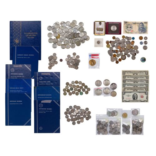 $43.40 face value US 90% silver including a 1880 Morgan $1, a 1943 Walking Liberty 50c, (4) 1964 Kennedy 50c, (17) Standing Liberty 25c, (84) Washington 25c, (56) Mercury 10c and (88) Roosevelt 10c, $29.50 face value US 40% silver Kennedy 50c, (24) US 35% silver war nickels, (40) Liberty 5c, (44) Buffalo 5c, (35) Indian 1c and assorted Jefferson 5c (most in Whitman folders), (5) $1 silver certificates and a 1953-C 2$ bill, (2) Commemorative coins, (5) 0.500 silver 25-pesos, a 1944 0.720 silver peso and assorted foreign coins (some mixed purity silver noted)