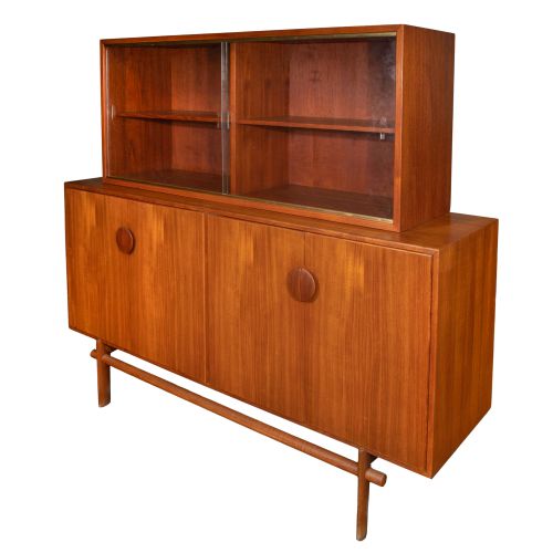(2) c.1950 teak veneered items including a display case having sliding glass doors and a sideboard having pole style legs and distinctive wood pulls, doors opening up to top drawers and a shelf, manufacturer's stamps on backsides