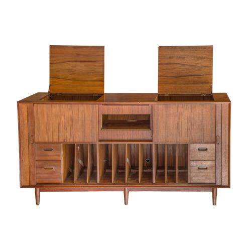 Model P.D 191, having four drawers, LP storage slots, sliding doors and two top access doors, including an attached Garrard turntable and a Model 64 Tandberg reel to reel player