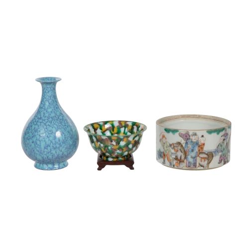 (3) items including a vase having a robin's egg blue glaze, an illegible impressed mark on underside, as well as a sancai glazed bowl having an underglaze carving of a dragon in clouds and Kangxi mark on underside and a famille rose pot having illegible red seal on underside