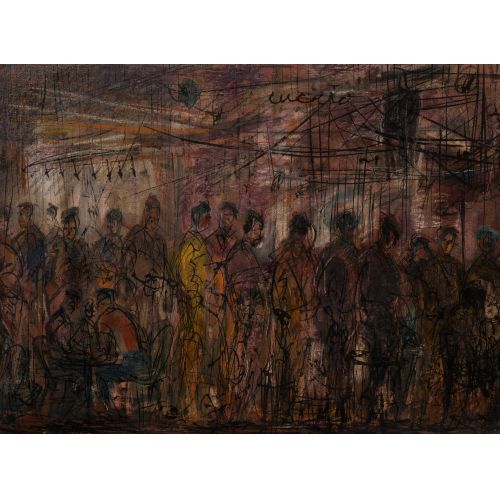 Undated, signed, depicting a crowded bar, in a gold-tone wood frame