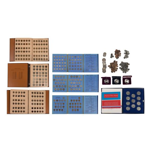 $9.50 face value US 90% silver Including (5) Morgan $1, a peace $1 and (35) Roosevelt 10c (in a Whitman folder), (2) 40% US silver Kennedy 50c, (4) partial coin folders including buffalo 5c, Jefferson 5c, Indian 1c and Wheat 1c, approximately (100) assorted wheat 1c, (3) .999 silver eagles in presentation boxes, an America's First Medals pewter coin set and a partial Canadian small 1c folder