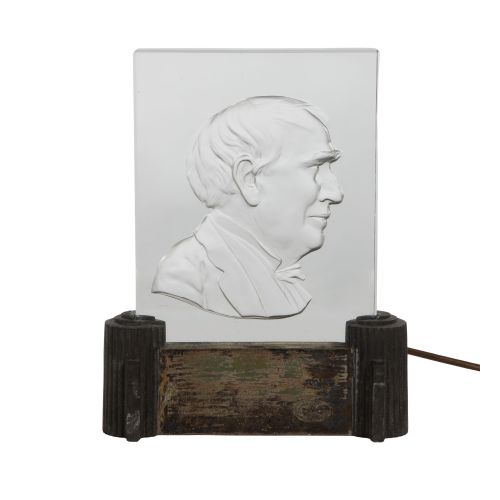 An intaglio panel portrait of Thomas Edison having a metal base, produced in 1929, never for sale, special order from Henry Ford, used as favors at the Golden Jubilee Banquet given for Thomas Edison at the opening of Henry Ford Museum, marked "Steuben" on bottom side of glass , 1929" on front of chrome light box "Association / 18 EDISON 85 / ILLUMINATING CO'S"