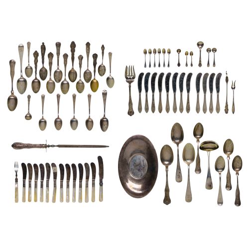 Including mismatched utensils and serving dishes such as individual butter knives, serving spoons, spoon, a tray and knife sharpener (most marked "sterling" / "925")
