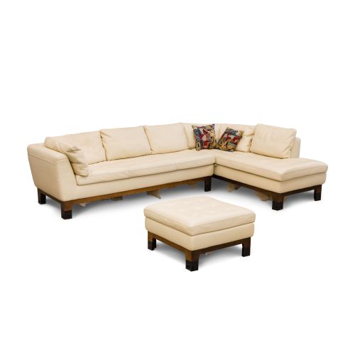 (3) items including a sofa, lounge and ottoman, having cream leather upholstery, tufted bench seats, removable zippered back cushions and a dark wood frame