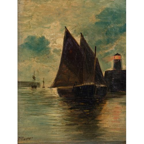 Undated, illegibly signed, depicting a harbor scene, in a gold-tone painted wood frame, some notations verso
