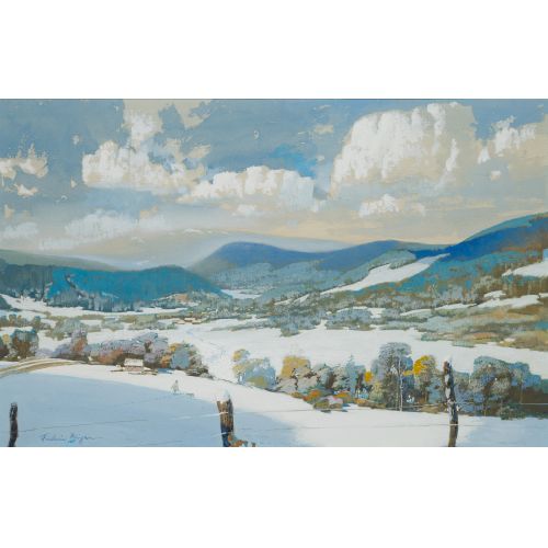 Undated, signed, depicting a mountainous winter landscape, a hunter and his dog, matted under glass in a wood frame