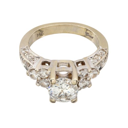 Having a high mount round cut center diamond weighing approximately 1.08 carats, G/H color, I-2 clarity, flanked on each side by three round cut diamonds and a diamond accented shank, side diamonds weighing approximately 0.76 carat total (marked "14k")