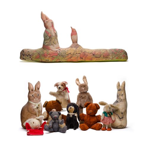 (11) items including a Peter Rabbit draft stopper, (2) folk art rabbit door stoppers as well as (8) various stuffed bears, rabbits, puppets from makers such as Stieff, Boyd's Bears, Ideal