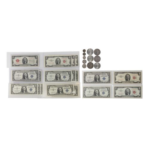 $6.80 face value US 90% silver including (6) Morgan $1, (2) Washington 25c and (3) Mercury 10c, US currency including a $2 1928-G red seal, a $2 1953-C red seal star note, a $2 1953 red seal, (3) $2 1953-B consecutive serial run, a $1 1935-A star note, (3) $1 1935-E consecutive serial run, (2) $1 1935-F consecutive serial run star notes, (3) $1 1957 consecutive serial run, (2) $1 1957 consecutive serial run and a 1957-B star note