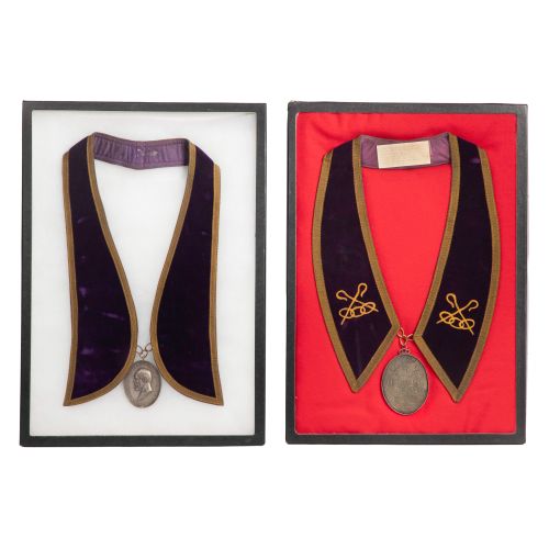(2) reproduction bronze medallions of the Presidential Peace Medal presented to tribal chiefs to honor brokered peace treaties, including President W. H. Harrison and President James Garfield, both having presentation collars, typewritten notations and presented in specimen box frames