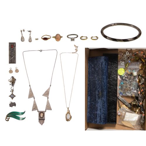 Including a fine necklace, a tear drop form opal pendant, a pair of hoop earrings, a pair of earring jackets, a cameo ring and a single earring backer (most marked "14k"), a red stone ring (marked "10k"), a bangle, a necklace and pendant set, a CZ ring, a gold-tone brooch pin, a filigree and cameo necklace, filigree tear drop earrings and a bus charm (most marked "925" / "sterling"), a European silver filigree lipstick holder (marked ".800" silver) and assorted costume jewelry rings, pins, earrings, wristwatches, a pen knife and (2) empty presentation boxes
