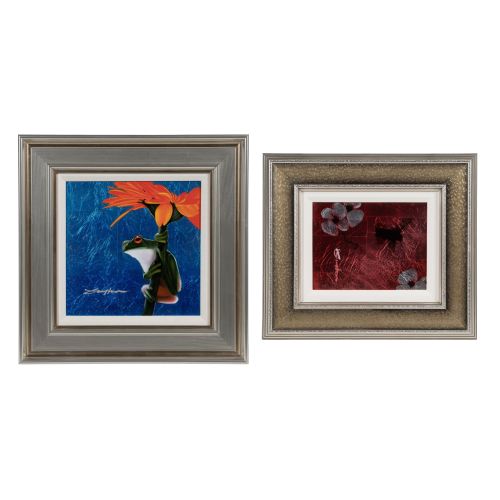 (2) undated items, signed, silver leaf on aluminum, including "Gimme Shelter" depicting a frog hanging from an orange blossom against a textured blue background and "Mini Bird Series (Red)" depicting a hummingbird and cherry blossoms, both in silver-tone painted wood frames, having paperwork