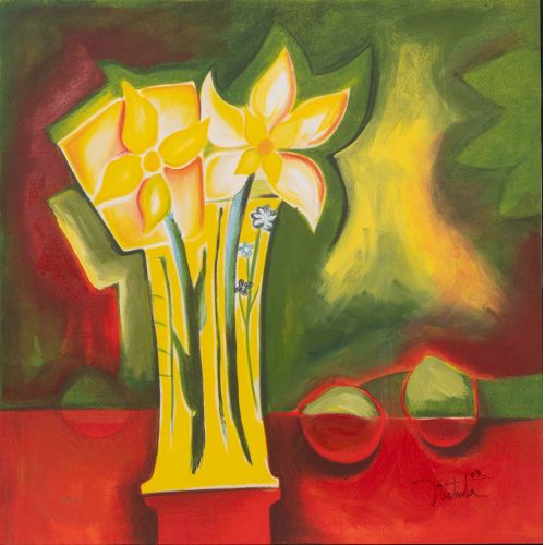 2003, signed, #38/45, hand colored lithograph depicting a yellow flower, float matted under acrylic in a gold-tone and black painted wood frame