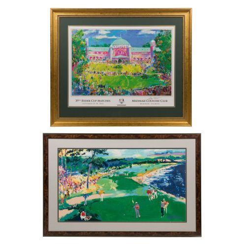 (2) items including 1998 "18th at Pebble Beach" serigraph having printed signature and 2012 "39th Ryder Cup Matches" offset lithograph poster, ink signed, having Cobalt Artworks, Louisville, Kentucky COA, both matted behind acrylic in wood frames