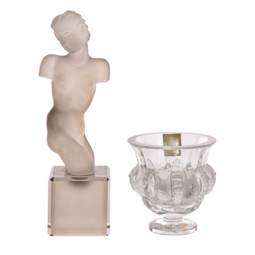 (2) total items including the Lalique vase having engraved mark and "Made in France" label underside as well as a "Cristal / Lalique / Paris" label to interior of lip; together with a Czech Kusak Cut Glassworks "Ingrid" frosted glass sculpture on cube base