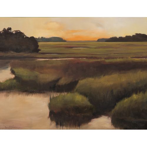 Undated, signed lower left, depicting a stream meandering across meadow land, in a gold-tone wood frame