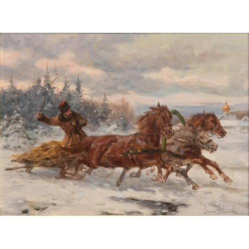 Undated, signed lower right, depicting a man on a horse-drawn sleigh, in a gold-tone composite on wood frame having Conrad's Inc. European Antique Importers sticker verso