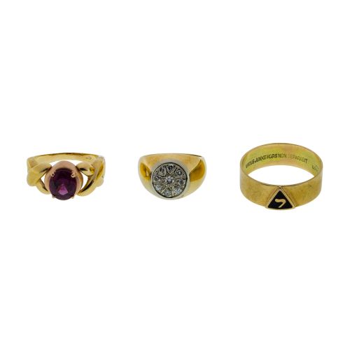 (3) items including a diamond accented ring, an oval cut gemstone ring and a signet style band (one marked "10k")