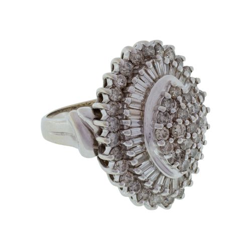 A cathedral / cluster setting having a marquise shaped diamond accented center surrounded by two steps of baguette and round cut diamonds, weighing approximately 2.45 carats total (marked "14k"), presentation box