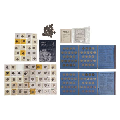 Including (75) Buffalo 5c, (20) Liberty 5c, (24) US 35% silver War Nickels, (2) partial Jefferson 5c folders, (20) Jefferson 5c and an empty Buffalo 5c folder